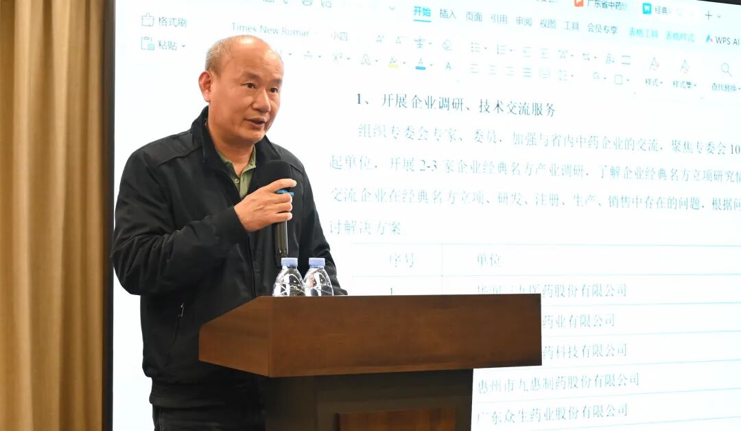 大会很荣幸邀请到省药品监管局原副局长严振出席并作指导讲话。他指出,专委会是协会服务行业的重要抓手,协会在新年伊始召开工作会议,总结过去、谋划未来,非常及时和必要。他充分肯定各专委会协助协会服务政府、服务行业、服务会员所取得的扎实成效,并对“讲好中药创新故事”与年度调研工作提出了指导性建议,强调故事的编撰应突出广东中药产业的独特优势与创新实践,系统总结“十四五”发展亮点,为产业传承创新提供有价值的参考。