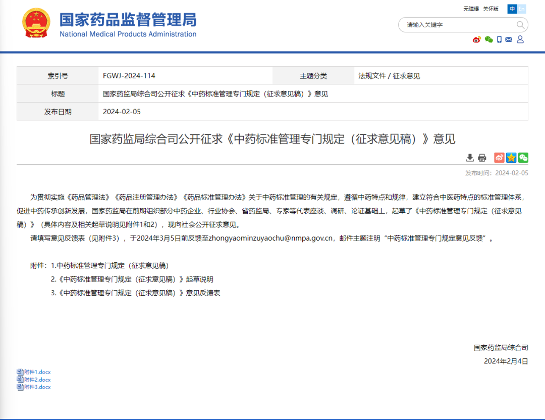 2024年2月5日国家药监局发布《中药标准管理专门规定(征求意见稿)》面向社会公开征求意见。如有反馈意见,请协会会员单位可于2024年3月1日前填写意见反馈表反馈至gdszyxh@126.com,邮件主题注明“中药标准管理专门规定意见反馈”,由广东省中药协会汇总反馈到国家药监局综合司。附件1:中药标准管理专门规定(征求意见稿)点此下载附件1
