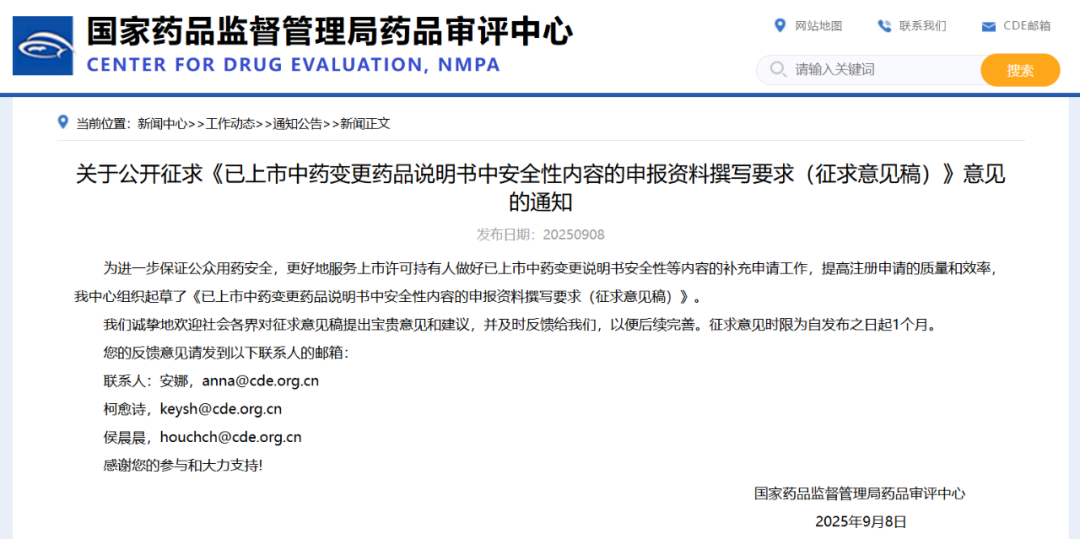 为进一步保证公众用药安全,更好地服务上市许可持有人做好已上市中药变更说明书安全性等内容的补充申请工作,提高注册申请的质量和效率,我中心组织起草了《已上市中药变更药品说明书中安全性内容的申报资料撰写要求(征求意见稿)》。