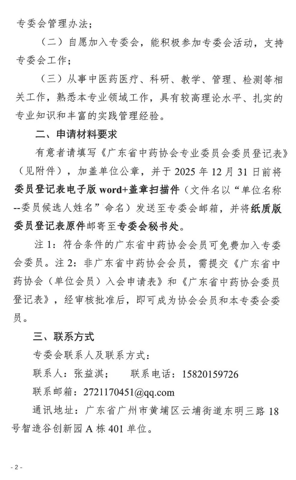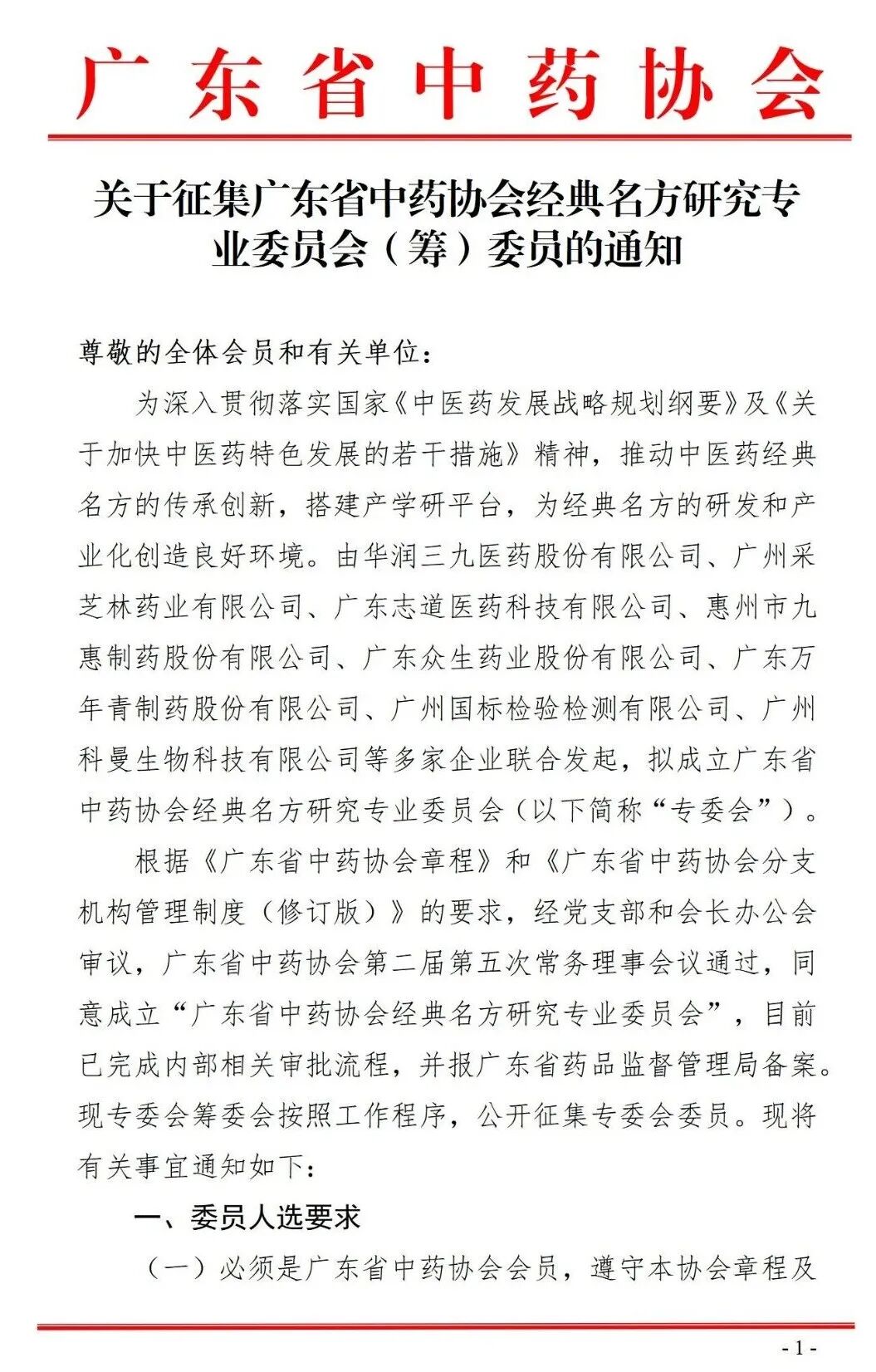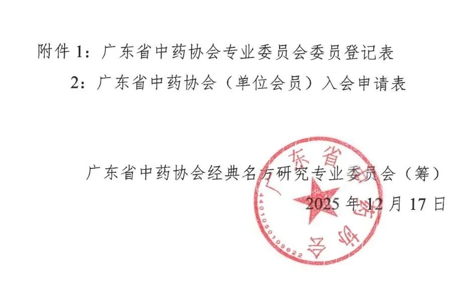 点击以下链接下载附件: 通知文件:关于征集广东省中药协会经典名方研究专业委员会(筹)委员的通知.pdf 附件1:广东省中药协会经典名方研究专业委员会委员登记表 附件2:广东省中药协会(单位会员)入会申请表广东省中药协会联系电话:020-37674020地址:广州市越秀区东风东路753号天誉商务大厦东塔2002室广东省中药协会