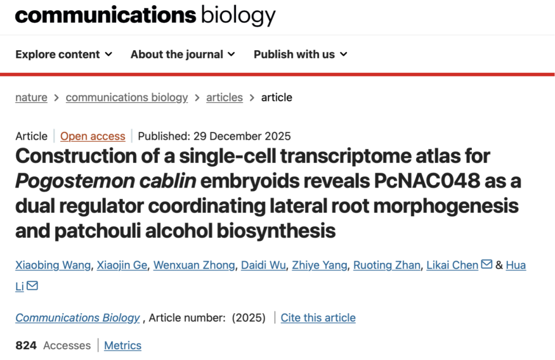 2025年12月29日,广东省中药协会中药质量控制与标准研究专业委员会主任委员,广东省药品检验所李华团队与广州中医药大学詹若挺/陈立凯团队联合在Nature旗下期刊Communications Biology(中科院生物学一区Top期刊)发表题为“Construction of a single-cell transcriptome atlas for Pogostemon cablin embryoids reveals PcNAC048 as a dual regulator coordinating lateral root morphogenesis and patchouli alcohol biosynthesis”的研究论文。该研究首次构建了特色南药广藿香(Pogostemon cablin胚状体单细胞转录组图谱,并挖掘鉴定双重调控因子PcNAC048,其同时参与调控侧根形态建成和广藿香醇生物合成。