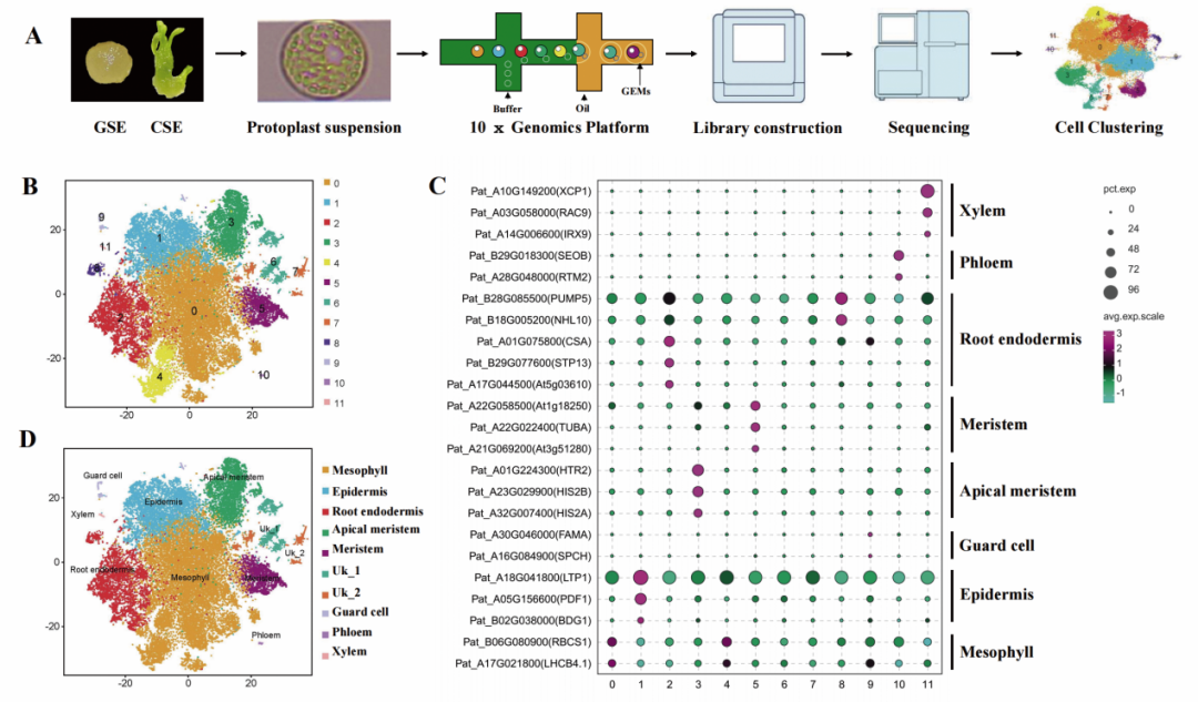 该论文以芳香药用植物广藿香为研究对象,通过花药离体培养诱导其小孢子发育阶段形成球形、心形、鱼雷形和子叶形等不同阶段的体细胞胚胎,选取丰度较高的球形(GSE)和子叶形(CSE)体细胞胚胎进行单细胞RNA测序,构建了广藿香体细胞胚胎的单细胞转录组图谱,鉴定出叶肉细胞、表皮细胞等8种细胞类型,并通过拟时间分析重构了顶端分生组织细胞向表皮细胞的分化轨迹;进一步筛选出关键转录因子PcNAC048,经生物信息学分析、亚细胞定位、转基因实验、酵母单杂交、双荧光素酶实验及瞬时过表达与病毒诱导的基因沉默(VIGS)等实验验证,证实PcNAC048不仅能响应低温、盐、干旱等非生物胁迫,还可促进拟南芥侧根发育,同时通过与广藿香醇合成酶基因PcPTS的启动子结合并抑制其活性,负调控广藿香醇的生物合成。该研究不仅为广藿香的发育生物学研究提供了宝贵的单细胞数据资源,还揭示了一个全新的调控节点PcNAC048,为广藿香的种质创新及药用成分调控提供了重要理论支撑。