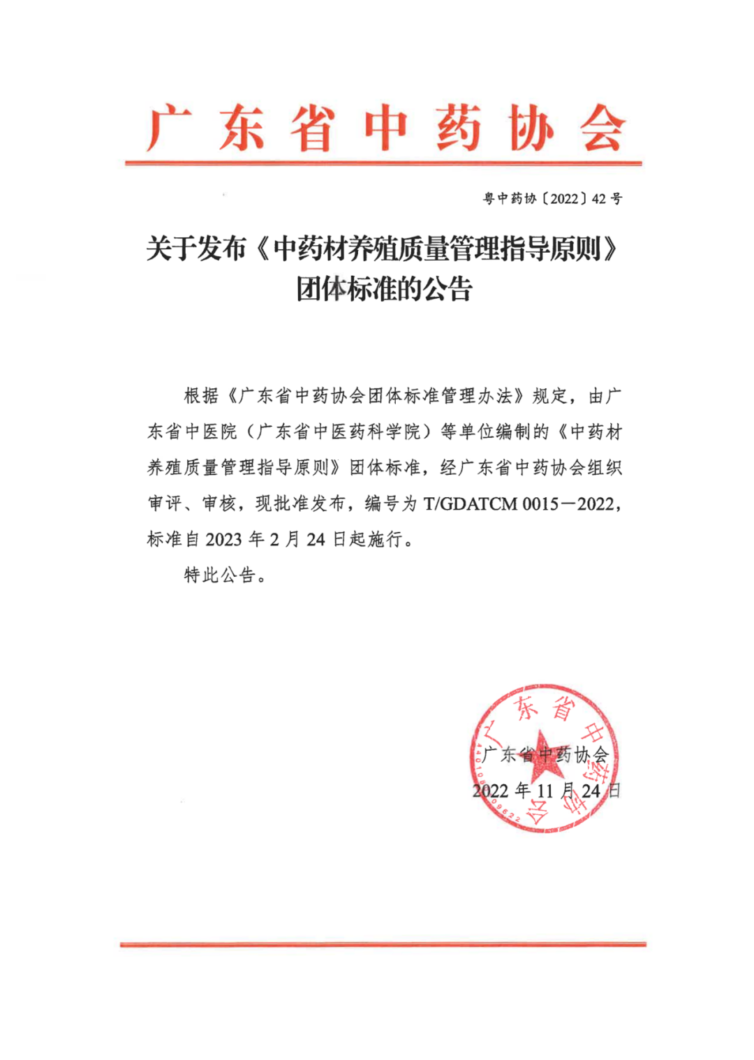 关于发布《中药材养殖质量管理指导原则》团体标准的公告